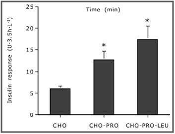 Research demonstrates that the addition of whey protein to a carbohydrate (CHO) drink, post-workout, accelerated muscle glycogen synthesis compared to CHO alone. The result may be attributed to a greater insulin response to the CHO/PRO combination than with CHO alone (see Figure 1).