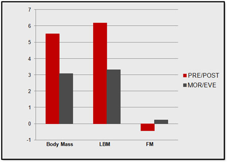 Figure 1: Training results from 23 experienced recreational bodybuilders resistance training for 10 weeks with all things (diet, supplements, training, etc.) equal except the addition of pre/post feedings. Significantly greater gains in body mass, LBM & strength were realized for the pre/post feeding subjects with a concurrent reduction in fat mass.