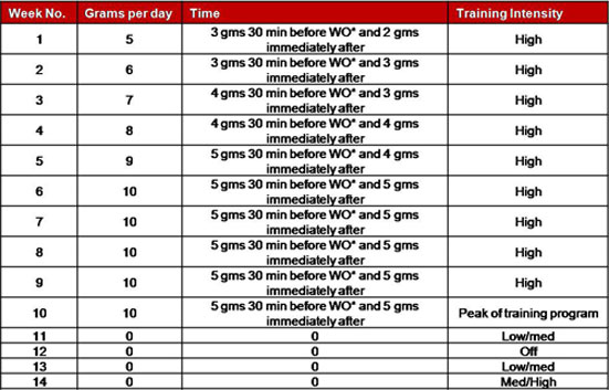 • From day 5 onward, ingest 5 grams (2.5 grams pre-exercise and 2.5 grams post-exercise) daily