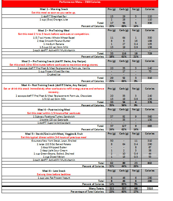 Using the menu below, arrange your meals around your training schedule. Space your meals no more than three to four hours apart. Other than your pre- and post-training meals and snacks, you may eat the remaining meals in any order that fits your lifestyle or venue.