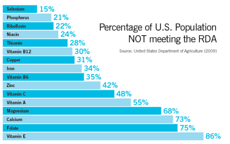 Don’t be too hard on your client for taking this study out of context – that’s the media’s fault. No nutrition scientist would ever stop telling people to take a TRUE COMPLETE 3rd Party tested DAILY multivitamin and mineral (MVM) to fill unavoidable and known nutrition gaps because they all take a real MVM themselves, and it would be irresponsible since everyone has gaps (see the 2015-2020 Dietary Guidelines report where all Americans are below the RDA on many nutrients and the majority is in dangerous territory on 7 essential nutrients). While virtually everyone is missing multiple nutrients, this graph of data from the USDA tells us how much of the population misses these individual nutrients.